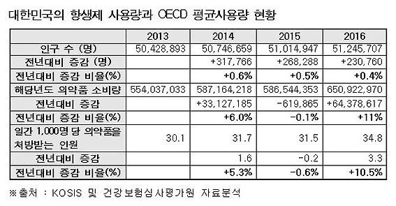 2013³â ´ëºñ 2016³â¿¡ ±¹³» Àα¸¼ö´Â 1.6%(81¸¸ 6õ814¸í) Áõ°¡ÇÑ ¹Ý¸é, Ç×»ýÁ¦ ¼Òºñ·®Àº 17.5%(9õ688¸¸ 5õ937DDD) Áõ°¡Çß°í, ÀǾàǰÀ» ó¹æ ¹ÞÀº ȯÀÚ ¼ö´Â 15.6%(4.7DID) Áõ°¡ÇÑ °ÍÀ¸·Î ³ªÅ¸³µ´Ù.