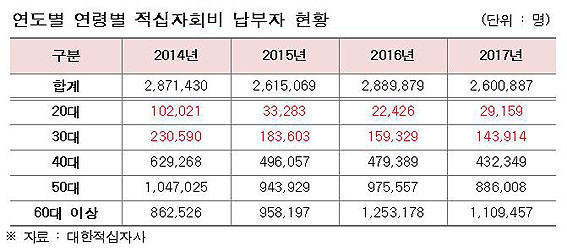 ´ëÇÑÀû½ÊÀڻ簡 À̸í¼ö À§¿øÀå¿¡°Ô Á¦ÃâÇÑ ÀÚ·á¿¡ µû¸£¸é, ÃÖ±Ù 4³â°£ ¿¬·É´ëº° Àû½ÊÀÚȸºñ ³³ºÎÀÚ ÇöȲÀ» º¸¸é, 20´ëÀÇ °æ¿ì 2014³â 10¸¸ 2õ21¸í, 2015³â 3¸¸ 3õ293¸í, 2016³â 2¸¸ 2õ426¸í, 2017³â 2¸¸ 9õ159¸íÀ¸·Î 2014³â ´ëºñ 2017³â¿¡ 7¸¸ 2õ862¸í(71.4%) °¨¼ÒÇÑ °ÍÀ¸·Î ³ªÅ¸³µ´Ù.