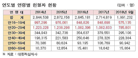´ëÇÑÀû½ÊÀڻ簡 À̸í¼ö À§¿øÀå¿¡°Ô Á¦ÃâÇÑ ÀÚ·á¿¡ µû¸£¸é, 2017³â ±âÁØ Àüü ÇåÇ÷ÀÚ 271¸¸ 4õ819¸í Áß 10¡¤20´ë°¡ 193¸¸ 1õ531¸íÀ¸·Î Àüü 71.1%¸¦ Â÷ÁöÇϰí ÀÖ´Â °ÍÀ¸·Î ³ªÅ¸³µ´Ù.