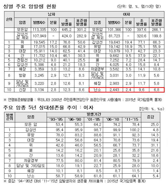 2015³â ±¹°¡¾Ïµî·ÏÅë°è¿¡ µû¸£¸é, 3´ë ¿©¼º¾ÏÀÎ À¯¹æ¾Ï, ÀڱðæºÎ¾Ï, ³¼Ò¾Ï Áß 5³â »ó´ë»ýÁ¸À²ÀÌ 64.1%·Î ³¼Ò¾ÏÀÌ °¡Àå ³·¾ÒÀ¸¸ç, ³¼Ò¾ÏÀº ¿©¼º¾Ï Áß ¹ß»ýÀ²ÀÌ 2%·Î ³·Àº Èñ±Í¾Ï¿¡ ¼ÓÇÏÁö¸¸, Áø´Ü°ú Ä¡·á°¡ ¾î·Á¿ö »ç¸Á·üÀº ¿©¼º¾Ï Áß °¡Àå ³ôÀº Æí¿¡ ¼ÓÇÏ´Â °ÍÀ¸·Î ³ªÅ¸³µ´Ù.