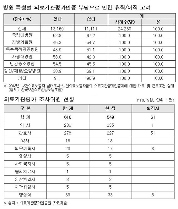 2018 º¸°ÇÀÇ·á³ëµ¿ÀÚ ½ÇÅÂÁ¶»ç¡¯¿¡ µû¸£¸é, ÀÎÁõÆò°¡ ¶§¹®¿¡ ÈÞÁ÷À̳ª ÀÌÁ÷À» °í·ÁÇØ º» °æÇèÀÌ ÀÖ´Â ³ëµ¿ÀÚµéÀº ÀÀ´äÀÚÀÇ 54.2%À̸ç, º´¿ø ³ëµ¿ÀÚµéÀº ÀÇ·á±â°üÆò°¡ÀÎÁõÀÌ ¡®ÀǷἺñ½º Áú Çâ»ó¡¯°ú ¡®È¯ÀÚ ¾ÈÀü¡¯¿¡ ¹ÌÄ¡´Â ±àÁ¤Àû ¿µÇâ¿¡ °¢°¢ 49.7Á¡°ú 45.3Á¡À» ¸Å°Ü Àý¹Ý¿¡µµ ¹ÌÄ¡Áö ¸øÇÏ´Â °á°ú°¡ ³ª¿Ô´Ù.