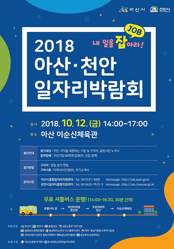 ¾Æ»ê½Ã¿Í õ¾È½Ã°¡ °øµ¿À¸·Î °³ÃÖÇÏ´Â ¡®2018 ¾Æ»ê¡¤Ãµ¾È ÀÏÀÚ¸®¹Ú¶÷ȸ¡¯°¡ 10¿ù 12ÀÏ ¿ÀÈÄ 2½ÃºÎÅÍ 5½Ã±îÁö ¾Æ»êÀ̼ø½ÅüÀ°°ü¿¡¼ ¿¸°´Ù.