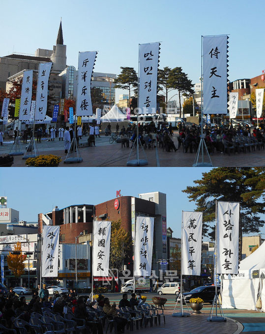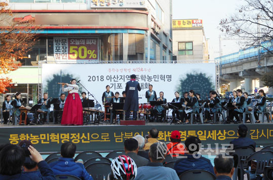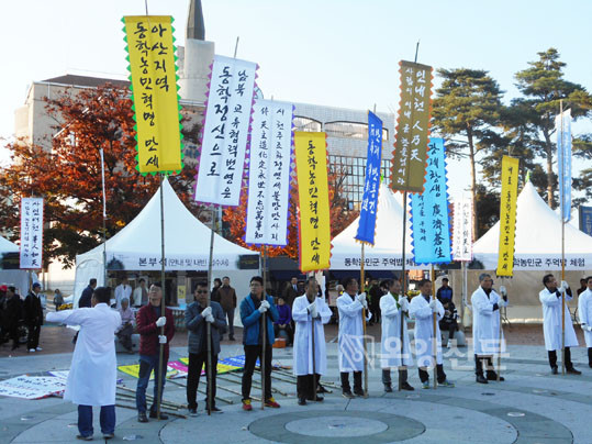 À̳¯ (»ç)µ¿Çгó¹ÎÇõ¸í¾Æ»ê½Ã±â³ä»ç¾÷ȸ Àå¸íÁø ÀÌ»çÀåÀº ±â³ä»ç¸¦ ÅëÇØ ¡°µ¿Çгó¹ÎÇõ¸íÀº ¹ÝºÀ°Ç, ¹Ý¿Ü¼¼ ÅõÀïÀ¸·Î ¿ì¸® ¹ÎÁ·»ç¿¡ ±æÀÌ ºû³¯ ¿ª»çÀû »ç°ÇÀ¸·Î, ¹«´ÉÇÏ°í ºÎÆÐÇÑ Á¶¼±¸» ºÀ°Ç¿ÕÁ¶¿¡ ¸Â¼ ½ÅºÐÁ¦ ¾Æ·¡ ½ÅÀ½ÇÏ´ø ¹é¼ºµéÀÌ ¡®´©±¸³ª ÇÏ´ÃÀ» ¸ð½Å Á¸À硯¶ó´Â °¢¼ºÀ¸·Î ¸¸¹ÎÆòµî(Ø¿ÚÅøÁÔõ)ÀÇ ±âÄ¡¸¦ ³ôÀÌ µé°í, ¡®³ª¶ó¸¦ ¹Ù·Î Àâ°í ¹é¼ºÀ» »ì¸®ÀÚ¡¯´Â º¸±¹¾È¹Î(ÜÐÏÐäÌÚÅ)ÀÇ Á¤½ÅÀ¸·Î ¶³ÃÄ ÀÏ¾î³ °Í¡±À̶ó°í ¼Ò°³Çß´Ù.