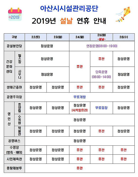 ¼³ ¿¬ÈÞ ±â°£ ¿î¿µ¿¡ °üÇÑ ÀÚ¼¼ÇÑ »çÇ×Àº °ø´Ü ȨÆäÀÌÁö(www.asanfmc.or.kr)¸¦ Âü°í ÇÏ¸é µÈ´Ù.