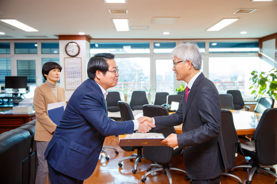 ÇÑÆí Çà»ç´Â Á÷¿ø´ëÇ¥ÀÇ ²É´Ù¹ß Àü´Þ, ÃëÀÓ»ç ÈÄ ½Ã¹ÎȦ ÀÔ±¸¿¡¼ Á÷¿øµé°ú ¾Ç¼öÇϸç ÃëÀÓÀλ縦 ³ª´³´Ù.