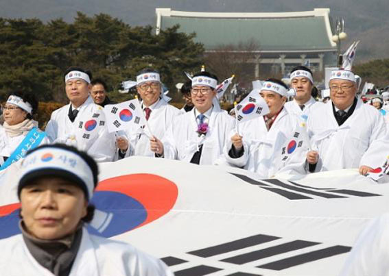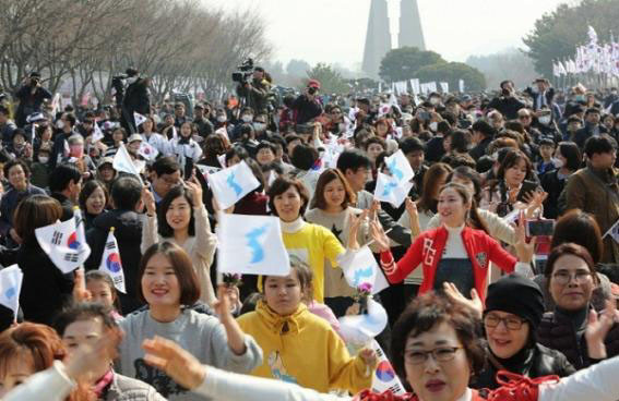 À̳¯ Âü°¡ÀÚµéÀº Áý°áÀå¼ÒÀÎ µ¶¸³±â³ä°ü ÀÔ±¸ Áß¾Ó±¤Àå¿¡¼ ÃÖ¿µ½Ä ÁغñÀ§¿øÀåÀÇ »çȸ·Î °£´ÜÇÑ °³È¸½Ä°ú ÇÔ²² ¡®ÅëÀÏÀ̿´ٳס¯ Ç÷¡½Ã¸÷À» ½Ã¿¬ÇÑ ÈÄ Ç³¹°´Ü »ç¹°»ç¶û(´ëÇ¥ ¹ÚÁö¿µ) Àå´Ü¿¡ ¸ÂÃç ´ëÇüűرâ¿Í 3.1¿îµ¿ 100ÁÖ³â±â³ä ·Î°í¿Í ±¹¹ÎÀÌ ÁöŲ ¿ª»ç, ±¹¹ÎÀÌ À̲ø ³ª¶ó°¡ »õ°ÜÁø ´ëÇüÇö¼ö¸·À» ÆîÃĵé°í Á¶¼±¹ÎÁ· ´ëÇ¥ 33ÀÎÀÇ ¸ð½ÀÀ» ÇÑ »çȸ, Á¾±³, ´Üü ´ëÇ¥¿Í ½Ã¹Î Çлý µî ±ä Çà·ÄÀÇ Âü°¡ÀÚµéÀÌ Å±ر⠹°°áÀ» ÀÌ·ç¸ç ±â³ä½Ä Àå¼ÒÀÎ °Ü·¹ÀÇÅ«¸¶´ç±îÁö °Å¸® ÇàÁøÀ» ¹ú¿´´Ù.
