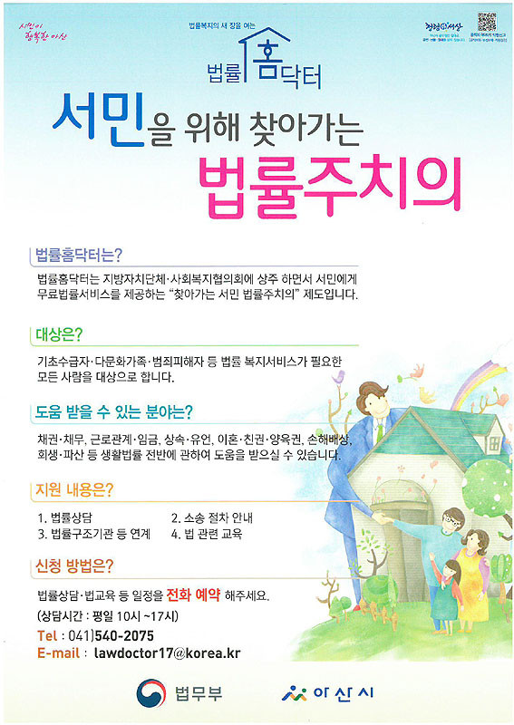 »ó´ãÀº ÆòÀÏ ¿ÀÀü 10½ÃºÎÅÍ ¿ÀÈÄ 5½Ã±îÁö ¾Æ»ê½Ãû ¹Î¿ø½Ç ³»¿¡ ¹ý·ü»ó´ã½Ç¿¡¼ °¡´ÉÇϸç, »çÀü ÀüÈ¿¹¾à(041-540-2075)À» ÅëÇØ ÀÏÁ¤À» Á¤ÇÒ ¼ö ÀÖ´Ù.