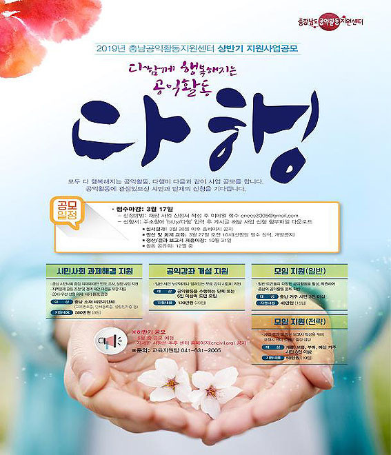 Ãæ³²°øÀÍȰµ¿Áö¿ø¼¾ÅͰ¡ ÀÌ´Þ 17ÀϱîÁö µµ¹Î°ú ½Ã¹Î»çȸÀÇ ÀÚ¹ßÀûÀÎ °øÀÍȰµ¿À» Áö¿øÇÏ´Â ¡®´ÙÇ࡯ »ç¾÷À» °ø¸ðÇÑ´Ù.