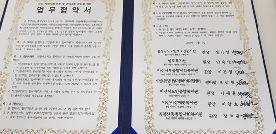 À̳¯ Çù¾à¿¡ ÇÔ²²ÇÑ 7°³ »çȸº¹Áö±â°üÀº ¼º¸ðº¹Áö¿ø(¿øÀå ¾È¼÷¿µ), ¾Æ»ê¼ºÎÁ¾ÇÕ»çȸº¹Áö°ü(°üÀå À̰ǿ), ¾Æ»ê½Ã°Ç°°¡Á¤´Ù¹®È°¡Á·Áö¿ø¼¾ÅÍ(¼¾ÅÍÀå Á¶»ïÇõ), ¾Æ»ê½Ã³ëÀÎÁ¾ÇÕº¹Áö°ü(°üÀå À̼¼À¶), ¾Æ»ê½ÃÀå¾ÖÀκ¹Áö°ü(°üÀå ÀÌâȣ), À½ºÀ»êµ¿Á¾ÇÕ»çȸº¹Áö°ü(°üÀå À庸À±), ÃæÃ»³²µµ³ëÀκ¸È£Àü¹®±â°ü(°üÀå Á¤¹Ì¼±)ÀÌ´Ù.