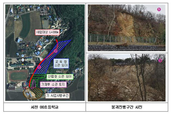 ¾ÈÀü°¨Âû ÁÖ¿ä °á°ú¸¦ º¸¸é, ¼Ãµ AÃʵîÇб³ÀÇ °æ¿ì À§Çè ±Þ°æ»çÁö°¡ ¹æÄ¡µÇ°í ÀÖ¾ú´Ù. ºØ±«°¡ ÁøÇà ÁßÀÎ ÀÌ ±Þ°æ»çÁö´Â ºñÅ»¸é °¢µµ 70µµ¿¡ ³ôÀÌ 35m, ±æÀÌ 330m·Î, Àü¹®°¡ ÀÚ¹® °á°ú ¡®ÀçÇØÀ§Çèµµ¡¯ 87Á¡À¸·Î ¡®Eµî±Þ¡¯ ÆÇÁ¤À» ¹Þ¾Ò´Ù.