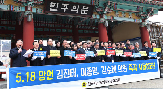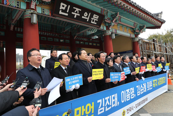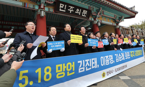 Àü±¹½Ã¡¤µµÀÇȸÀÇÀå´ÜÇùÀÇȸ´Â 2¿ù 15ÀÏ ±¤ÁÖ±¤¿ª½Ã ºÏ±¸¿¡ À§Ä¡ÇÑ ±¹¸³ 5¡¤18 ¹ÎÁÖ¹¦¿ª¿¡¼ ¡®5¡¤18 ¸Á¾ð ±Ôź´ëȸ¡¯¸¦ °®°í 5¡¤18À» ¿Ö°î¡¤ÆïÈÑÇÑ ÀÚÀ¯Çѱ¹´ç ±èÁøÅ¡¤ÀÌÁ¾¸í¡¤±è¼ø·Ê ÀÇ¿øÀÇ Á¦¸í°ú 5¡¤18À» ºÎÁ¤ÇÏ´Â ÇàÀ§¸¦ °·ÂÇÏ°Ô Ã³¹úÇÒ ¼ö ÀÖµµ·Ï ÇÏ´Â ¡®Çѱ¹ÆÇ Ȧ·ÎÄÚ½ºÆ® ºÎÁ¤ ó¹ú¹ý¡¯ÀÇ Á¶¼Ó Á¦Á¤À» Ã˱¸Çß´Ù.