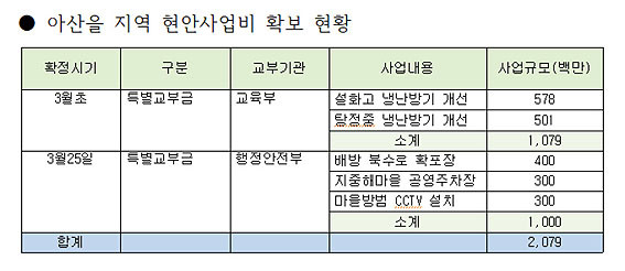 ° ÀÇ¿øÀº ¡°¾Æ»ê½Ã Áö¿ªÇö¾È»ç¾÷ ¹è¹æ Áß·Î1-1È£(ºÏ¼ö·Î) È®Æ÷Àå 4¾ï ¿ø, ÁöÁßÇØ¸¶À» °ø¿µÁÖÂ÷Àå Á¶¼º 3¾ï ¿ø°ú ¸¶À»¹æ¹ü CCTV ¼³Ä¡ 3¾ï ¿ø µî ÃÑ 3°Ç, 10¾ï ¿ø ±Ô¸ðÀÇ Æ¯º°±³ºÎ±ÝÀ» ÇàÁ¤¾ÈÀüºÎ·ÎºÎÅÍ È®º¸Çß´Ù¡±¸é¼ ¡°3¿ùÃÊ ±³À°ºÎ·ÎºÎÅÍ È®º¸ÇÑ ¼³È°í¿Í ÅÁÁ¤Áß ³Ã³¹æ±â °³¼±»ç¾÷ 10¾ï 7õ900¸¸ ¿øÀ» Æ÷ÇÔÇØ ¿ÃÇØ »ó¹Ý±â Ưº°±³ºÎ±Ý 20¾ï 7õ900¸¸ ¿øÀ» È®º¸Çß´Ù¡±°í ¸»Çß´Ù.