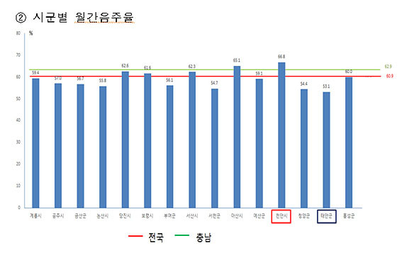| | ¡è¡è ¡ã½Ã±ºº° ¿ù°£À½ÁÖÀ² | ¨Ï ¿Â¾ç½Å¹® | | ¹Ý¸é ¿ù°£ À½ÁÖÀ²(ÃÖ±Ù 1³â µ¿¾È ÇÑ ´Þ¿¡ 1ȸ ÀÌ»ó À½ÁÖÇÑ »ç¶÷ ºÐÀ²)Àº 62.9%·Î Àü³â´ëºñ 0.7%p Áõ°¡Çß´Ù.
