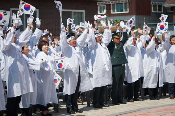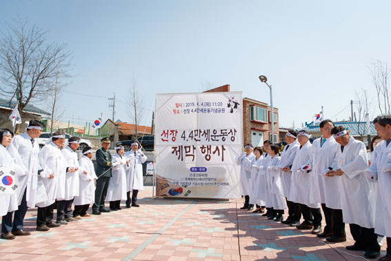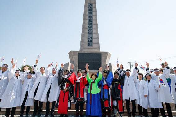 ÀÌ¾î ¿¸° ¡®1919³â ¼±Àå 4.4 ¸¸¼¼ ¿îµ¿»ó¡¯ Á¦¸·½Ä¿¡¼ ¿À ½ÃÀåÀº Ãà»ç¸¦ ÅëÇØ ¡°100³â Àü ¸ñ¼ûÀ» °É°í ¿ÜÃÆ´ø ¼±Á¶µéÀÇ 3.1¿îµ¿ Á¤½ÅÀ» ¸¶À½¿¡ »õ°Ü, ¾î¶°ÇÑ ¾î·Á¿òµµ À̰ܳ»¾î Àα¸ 50¸¸ÀÇ ÀÚÁ·µµ½Ã¸¦ ²Þ²Ù´Â ¾Æ»êÀÇ Èñ¸ÁÂù ¹Ì·¡ 100³âÀ» ¸¸µé¾î°¡ÀÚ¡±°í ´çºÎÇß´Ù.
