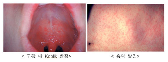 ÁÖ¿äÁõ»ó ¹× ÀÓ»ó°æ°ú¸¦ º¸¸é ¡âÀü±¸±â¿¡´Â Àü¿°·ÂÀÌ °ÇÑ ½Ã±â·Î, 3ÀÏ ³»Áö 5Àϰ£ Áö¼ÓµÇ¸ç ¹ß¿, ±âħ, Ä๰, °á¸·¿°, Ư¡ÀûÀÎ ±¸°³» º´º¯(Koplik¡¯s spot) µîÀÌ ³ªÅ¸³´Ù.