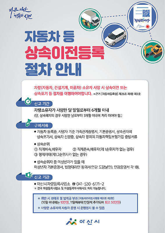 ¾Æ»ê½ÃÂ÷·®µî·Ï»ç¾÷¼Ò´Â Â÷·®¼ÒÀ¯ÀÚ »ç¸Á½Ã Â÷·® »ó¼ÓÀÌÀüÀÇ µ¶·Á¿Í ÇÔ²² »ó¼ÓÀÌÀü ¹ÌÀÌÇà½Ã¿¡ µû¸¥ °úÅÂ·á ¹× ¹üÄ¢±ÝÀÇ ºÒÀÌÀÍÀÌ ¾øµµ·Ï ½Ã¹ÎÈ«º¸¿¡ ³ª¼¹´Ù.