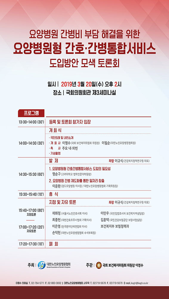 ±¹È¸ º¸°Çº¹ÁöÀ§¿øÈ¸ À̸í¼ö À§¿øÀå(¾Æ»ê°©)Àº 3¿ù 20ÀÏ ¿ÀÈÄ 2½Ã ±¹È¸ÀÇ¿øÈ¸°ü Á¦3¼¼¹Ì³ª½Ç¿¡¼ ¡®¿ä¾çº´¿øÇü °£È£¼ºñ½ºµµÀÔ¹æ¾È¡¯ Á¤Ã¥Åä·Ðȸ¸¦ °³ÃÖÇØ ÇöÀç ¿ä¾çº´¿øÀÇ °£È£°£º´½Ã½ºÅÛ Áø´Ü°ú ¿ä¾çº´¿ø¿¡ ¸Â´Â °£È£°£º´¼ºñ½º ¸ðµ¨ µµÀÔ ¹æ¾ÈÀ» ¸ð»öÇÒ ¿¹Á¤ÀÌ´Ù.