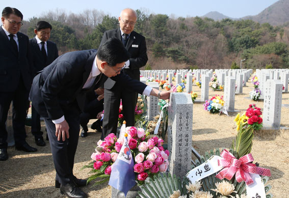 µµ ½Ç¡¤±¹Àå µî 14¸í°ú ÇÔ²² ±¹¸³´ëÀüÇöÃæ¿øÀ» ãÀº ¾ç Áö»ç´Â ÇöÃæÅ¾¿¡ ÇåÈ¡¤ºÐÇâÇϰí, õ¾ÈÇÔ ¹¦¿ªÀ» ã¾Æ ÀÚ½ÅÀÇ »ý¸íÀ» Èñ»ýÇϸç Á¶±¹°ú ±¹¹ÎÀ» ÁöÄѳ½ È£±¹¿µ·ÉÀ» ¾ÖµµÇÏ°í ³ÌÀ» ±â·È´Ù.