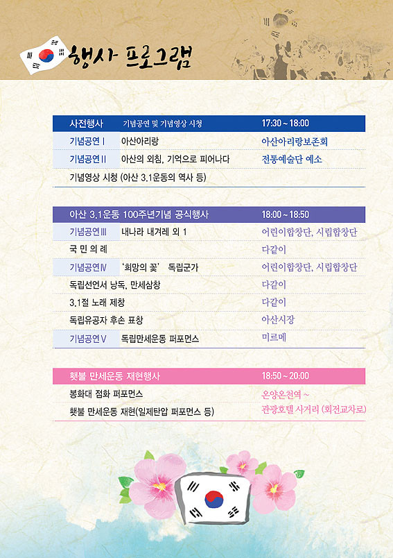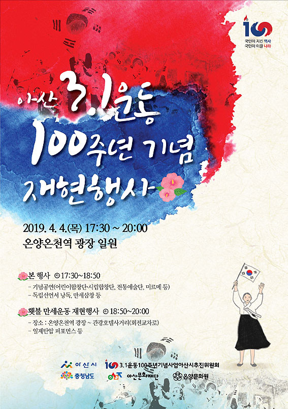 ƯÈ÷, ½Ã´Â 1919³â 3¿ù 11ÀÏ, ¿Â¾ç°ø¸³º¸ÅëÇб³ ÇлýµéÀÇ ÁÖµµ·Î ½ÃÀÛµÈ ¾Æ»êÁö¿ª ¸¸¼¼¿îµ¿ÀÇ Æ¯Â¡À» »ì·Á ±×µ¿¾È °ø°³¸ðÁý ÇØ ¿Â ¡®Ã»¼Ò³â 100ÀÎ ÀÇ¿´Ü¡¯À» Áß½ÉÀ¸·Î ¿Â ½Ã¹ÎÀÌ ÇÔ²² Âü¿©Çϴ ȶºÒ ¸¸¼¼¿îµ¿ ÀçÇöÇà»ç¸¦ ÁøÇàÇÑ´Ù.