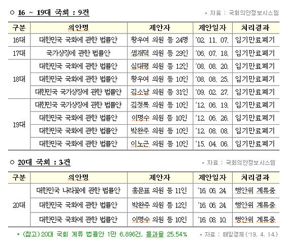 ¹«±ÃÈ´Â ¿ì¸® ¿ª»ç¿Í ±¹¹ÎµéÀÇ Á¤¼°¡ Åõ¿µµÈ ´ëÇ¥ÀûÀÎ ±¹°¡»ó¡À¸·Î ±× ¹ýÁ¦È ³ë·ÂÀº 2002³â 16´ë ±¹È¸ºÎÅÍ ½ÃÀÛÇØ 2015³â 19´ë ±¹È¸±îÁö ÃÑ 9Â÷·Ê ¹ý¾ÈÀÌ Á¦ÃâµÆÀ¸³ª ¸ðµÎ ÀÇ¿øÀӱ⸸·á·Î Æó±âµÆÀ¸¸ç, ÇöÀç 20´ë ±¹È¸¿¡ 3°ÇÀÇ °ü·Ã ¹ý¾ÈÀÌ °è·ù ÁßÀÌ´Ù.