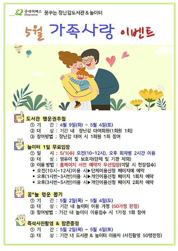5¿ù °¡Á·»ç¶û À̺¥Æ®´Â ¡ãµµ¼°ü Çà¿î±Ç Ãß÷ (4¿ù 9ÀÏ~5¿ù 4ÀÏ) ¡ã³îÀÌÅÍ 1ÀÏ ¹«·á ÀÔÀå(5¿ù 1ÀÏ) ¡ã²Þ³î Çà¿î»Ì±â(5¿ù 2ÀÏ~5¿ù4ÀÏ) ¡ã³îÀÌÅÍ Áï¼® »çÁøÃÔ¿µ ¹× ÆËÄÜÁõÁ¤(5¿ù 2ÀÏ~4ÀÏ) ÀÌ´Ù.