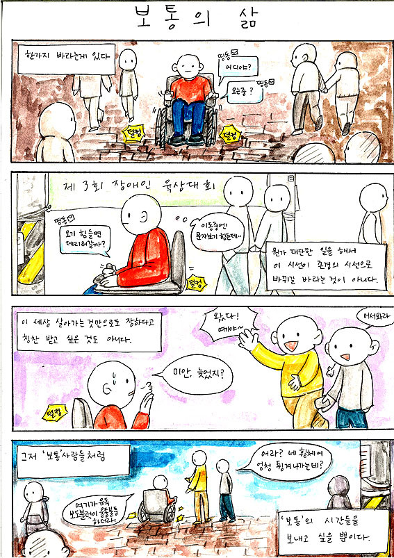 ¾Æ»ê½ÃÀå»óÀ» ¹ÞÀº Á¶¾Æ¶û ½Ã¹ÎÀÇ ÀÛǰÀº ºñÀå¾ÖÀο¡°Ô´Â Æò¹üÇϰí ÀÚ¿¬½º·¯¿î ÀÏ»óÀÌ Àå¾ÖÀÎÀÌÀ̶ó´Â ÀÌÀ¯·Î Ưº°ÇÏ°í °ü½ÉÀ» ¹Þ¾Æ¾ßÇÏ´Â ÀÏ»óÀÇ ¸ð½ÀÀ» Ä«Å÷À¸·Î Ç¥ÇöÇÑ ÀÛǰÀÌ´Ù. ÆíÀǽü³·Î ÀÎÇÑ ºÒÆíÇÔ°ú ´õºÒ¾î ºñÀå¾ÖÀεéÀÇ Æí°ß¾î¸° ½Ã¼±µµ Àå¾ÖÀο¡°Ô´Â Å« ºÒÆíÇÔÀÌ µÉ ¼ö ÀÖ´Ù´Â °ÍÀ» º¸¿©ÁÖ´Â ÀÛǰÀ¸·Î Àå¾ÖÀνݳ¼± °ø¸ðÀü ÃëÁö¿¡ ºÎÇÕÇÏ´Â ÀÛǰÀÌ´Ù.