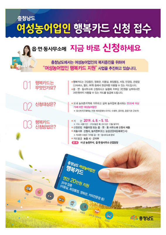¡®¿©¼º³ó¾î¾÷ÀÎ Çູ¹Ù¿ìó Áö¿ø»ç¾÷¡¯Àº ¿©¼º³ó¾î¾÷Àο¡°Ô Àü±¹ ¾îµð¼³ª Çö±Ýó·³ »ç¿ëÇÒ ¼ö ÀÖ´Â º¹ÁöÄ«µå¸¦ Á¦°øÇÏ´Â »ç¾÷À¸·Î ¹ß±Þ¹ÞÀº Ä«µå´Â ³óÇù Çϳª·Î¸¶Æ®¡¤°Ç°¡¤¿µÈ°ü¶÷¡¤µµ¼±¸ÀÔ¡¤¹Ì¿ë¿ø¡¤¾È°æÁ¡ µî ´Ù¾çÇÑ ¾÷Á¾¿¡¼ »ç¿ëÇÒ ¼ö ÀÖ´Ù.