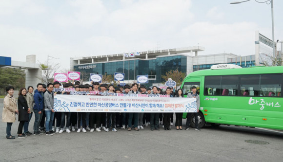 ¾Æ»ê½Ã½Ã¼³°ü¸®°ø´Ü(ÀÌ»çÀå ±è±¤½Ä, ÀÌÇÏ °ø´Ü)°ú ¾Æ»ê½ÃÀÚ¿øºÀ»ç¼¾ÅÍ(¹Ú±¤¼ø ¼¾ÅÍÀå)´Â 20ÀÏ(Åä) 10½Ã ¡®Ä£ÀýÇÏ°í ¾ÈÀüÇÑ ¾Æ»ê°ø¿µ¹ö½º ¸¸µé±â. ¾Æ»ê½Ã¹Î°ú ÇÔ²² ¸¸µé¾î¿ä!¡¯ Ä·ÆäÀÎ ¹ß´ë½ÄÀ» °³ÃÖÇß´Ù.