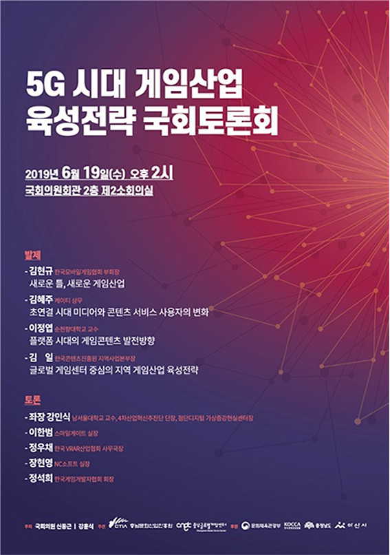 6¿ù 19ÀÏ °Èƽġ¤½Åµ¿±Ù ±¹È¸ÀÇ¿øÀÌ °øµ¿ ÁÖÃÖÇϰí (Àç)Ãæ³²¹®È»ê¾÷ÁøÈï¿ø(¿øÀå ±èÀμö)ÀÌ ÁÖ°üÇØ ¿¸° ¡®5G½Ã´ë °ÔÀÓ»ê¾÷ À°¼ºÀü·« ±¹È¸Åä·Ðȸ¡¯¿¡¼´Â 5G½Ã´ë¸¦ ¸ÂÀÌÇØ ¿ì¸®³ª¶ó °ÔÀÓ»ê¾÷¿¡ Ȱ·ÂÀ» ºÒ¾î³Ö°í ¼¼°èÀûÀÎ ÆÐ·¯´ÙÀÓÀ» ÁÖµµÇÒ ¼ö ÀÖ´Â ¹ßÀü¹æÇâ°ú ´ëÀÀÀü·«¿¡ ´ëÇØ ³íÀÇÇß´Ù.