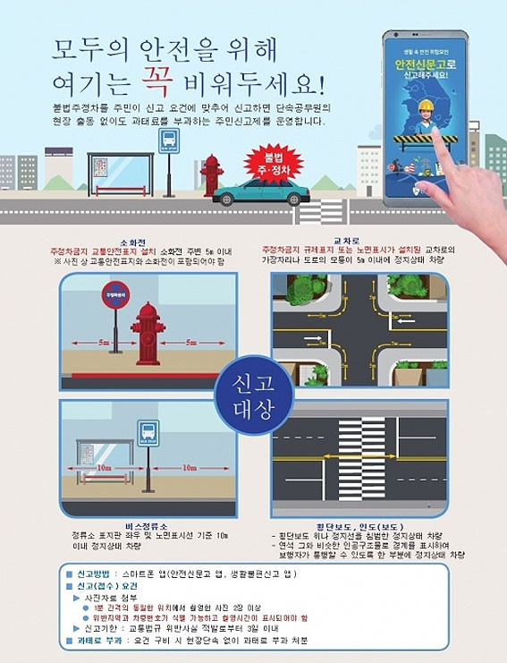 ÁÖÁ¤Â÷ Àý´ë ±ÝÁö±¸¿ª ÁֹνŰíÁ¦µµ´Â ´©±¸³ª ½º¸¶Æ®ÆùÀ» ÀÌ¿ëÇØ ¾ÈÀü½Å¹®°í¿Í »ýȰºÒÆí½Å°í ¾ÛÀ» ÅëÇØ ÁÖÁ¤Â÷ Àý´ë±ÝÁö ±¸¿ªÀÎ ¡â¼Ò¹æ½Ã¼³ 5m À̳» ¡â±³Â÷·Î ¸ðÅüÀÌ 5m ¡â¹ö½ºÁ¤·ù¼Ò 10m À̳»¿¡ ÁÖÂ÷µÈ Â÷·®À» µ¿ÀÏÇÑ À§Ä¡¿¡¼ 1ºÐÀÌ»ó °£°ÝÀ» µÎ°í 2ȸ ÃÔ¿µÇØ Àû¹ßÀϷκÎÅÍ 3ÀÏ À̳» ½Å°íÇÏ¸é °ø¹«¿øÀÇ ÇöÀå Àû¹ß ¾øÀ̵µ °úÅ·Ḧ ºÎ°úÇÏ´Â Á¦µµÀÌ´Ù.