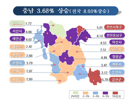 ½Ã¡¤±ºº° »ó½Â·üÀº ±Ý»ê±ºÀÌ 5.78%·Î °¡Àå ³ô¾Ò°í, õ¾È½Ã ¼ºÏ±¸(5.01%)¿Í ¼»ê½Ã(4.86%)°¡ µÚ¸¦ À̾úÀ¸¸ç, »ó½Â·üÀÌ °¡Àå ³·Àº Áö¿ªÀº ´çÁø½Ã(1.74%)·Î ³ªÅ¸³µ´Ù.