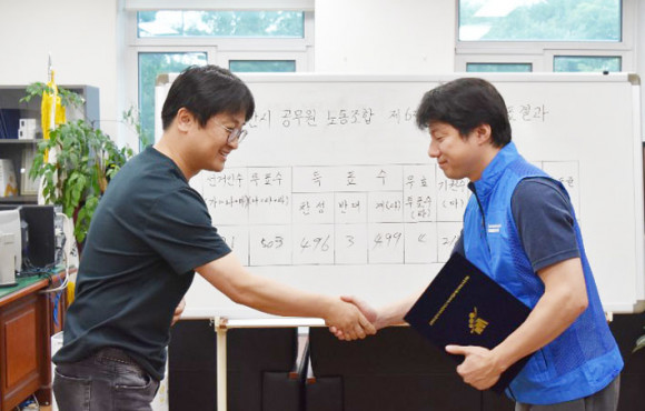 ´Üµ¶À¸·Î µî·ÏÇÑ Èĺ¸ÀÚ¿¡ ´ëÇÑ Âù¹Ý ÅõÇ¥´Â Áö³ 6¿ù 26ÀϺÎÅÍ 28ÀϱîÁö 3Àϰ£ ½Ç½ÃµÅ Àüü ÅõÇ¥ ´ë»ó Á¶ÇÕ¿ø(¼±°ÅÀμö) 721¸í Áß 503¸íÀÌ Âü¿©ÇØ 69.8%ÀÇ Âü°¡À²À» ±â·ÏÇß´Ù. 28ÀÏ ³ëÁ¶ »ç¹«½Ç¿¡¼ ÁøÇàµÈ °³Ç¥ °á°ú´Â Âù¼º 496Ç¥, ¹Ý´ë 3Ç¥, ¹«È¿ 4Ç¥·Î 98.6%ÀÇ ¾ÐµµÀûÀÎ ÁöÁö¸¦ ¾ò¾î Á¦6´ë ³ëÁ¶¸¦ À̲ø¾î °¡°ÔµÆ´Ù.
