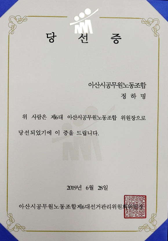 Á¤Çϸí Á¦6´ë ³ëÁ¶À§¿øÀå¿¡ ´ç¼±, 98.6%ÀÇ ¾ÐµµÀûÀÎ ÁöÁö