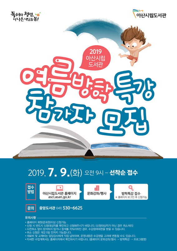 Âü°¡½ÅûÀº ¿À´Â 7¿ù 9ÀϺÎÅÍ µµ¼°ü ȨÆäÀÌÁö(ascl.asan.go.kr)¸¦ ÅëÇØ ¼±Âø¼øÀ¸·Î Á¢¼ö¿¹Á¤À̸ç, ±âŸ ÀÚ¼¼ÇÑ »çÇ×Àº ȨÆäÀÌÁö °øÁö»çÇ×À» Âü°íÇϰųª µ¶¼ÁøÈïÆÀ(041-530-6625)À¸·Î ¹®ÀÇÇÏ¸é µÈ´Ù.