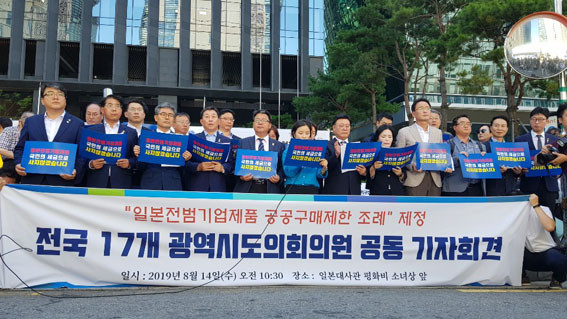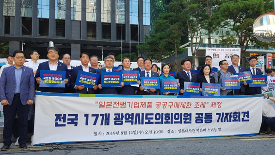 Ãæ³² µî Àü±¹ 17°³ ±¤¿ªÀÇ¿ø 29¸íÀº Áö³ 8¿ù 14ÀÏ ¼¿ï Á¾·Î±¸ ¼ÒÀç ÀϺ» ´ë»ç°ü ¾Õ¿¡¼ °øµ¿ ±âÀÚȸ°ßÀ» ¿°í Áö¹æÀÚÄ¡´Üü¿¡¼ ÀϺ» Àü¹ü±â¾÷ Á¦Ç°À» °ø°ø±¸¸Å ÇÏÁö ¾Ê´Â ³»¿ëÀÇ Á¶·Ê Á¦Á¤À» °øµ¿ ÃßÁøÇÑ´Ù°í ¹àÇû´Ù.