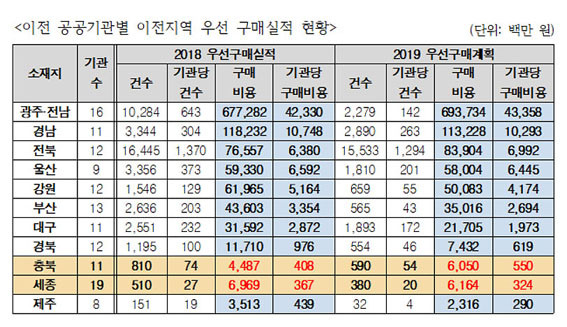 ±¸Ã¼ÀûÀ¸·Î º¸¸é ÃæºÏ Çõ½Åµµ½ÃÀÇ 11°³ ±â°üµéÀº 2018³â µ¿¾È ÃÑ 44¾ï 8õ700¸¸ ¿ø¾îÄ¡ÀÇ ÃæºÏ Áö¿ª»ý»ê ÀçÈ ¹× ¼ºñ½º¸¦ ¿ì¼±±¸¸ÅÇßÀ¸¸ç, ¼¼Á¾ Çõ½Åµµ½ÃÀÇ 19°³ ±â°üÀº °°Àº ±â°£ 69¾ï 6õ900¸¸ ¿ø ¾îÄ¡¸¦ ¿ì¼±±¸¸ÅÇß´Ù.