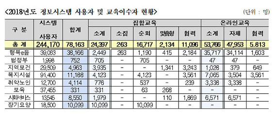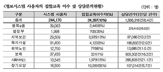 ÀÌ ÀÇ¿øÀº ÃÑ 8°³ Á¤º¸½Ã½ºÅÛ ºÐ¾ßº°·Î ±³À°À̼ö ÇöȲÀ» º¸¸é, º¸À°Á¤º¸½Ã½ºÅÛ »ç¿ëÀÚÀÇ °æ¿ì ÃÑ 3¸¸ 7õ455¸íÁß 1%µµ ä ¾È µÇ´Â 331¸í¸¸ÀÌ ÁýÇÕ±³À°À» À̼öÇÑ °ÍÀ¸·Î ³ªÅ¸³µ°í, ºÎ½ÇÇÑ ±³À° ¹× ±³À° ¹Ì À̼ö·Î ÀÎÇØ »çȸº¸ÀåÁ¤º¸¿ø¿¡ Á¤º¸½Ã½ºÅÛ ÀÌ¿ëÀ» ¹®ÀÇÇϱâ À§ÇÑ »ó´ã°Ç¼ö°¡ º¸À°Á¤º¸½Ã½ºÅÛ ÀÌ¿ëÀÚ 1Àδç 16.2°ÇÀ̳ª µÇ´Â °ÍÀ¸·Î ³ªÅ¸³µ´Ù.