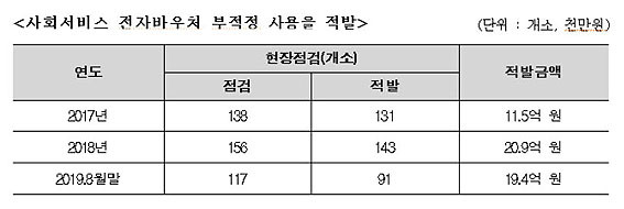 ÇöÀç »çȸº¸ÀåÁ¤º¸¿øÀº Á¤º¸½Ã½ºÅÛ ºÐ¼® ±â¹ý¿¡ ÀÇÁ¸ÇØ º¹Áö¼ºñ½º¸¦ ºÎÀûÀýÇÏ°Ô »ç¿ëÇÏ´Â ¹®Á¦¸¦ Àû¹ßÇϰí Àִµ¥, 2018³â¿¡´Â 143°Ç¿¡ 29¾ï ¿ø, 2019³â 8¿ù ÇöÀç´Â 91°Ç¿¡ 19.4¾ï ¿øÀÇ Àü¹Ù¹Ù¿ìó ºÎÀûÁ¤ »ç¿ëÀ» Àû¹ßÇÏ¿´´Ù.