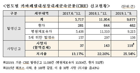Áúº´°ü¸®º»ºÎ°¡ À̸í¼ö ÀÇ¿ø¿¡°Ô Á¦ÃâÇÑ ÀÚ·á¿¡ µû¸£¸é 2018³â CRE °¨¿°Áõ ¹ß»ý½Å°í´Â 1¸¸ 1õ954°ÇÀ̸ç, ÀÌ Áß Ä¡·á°¡ ÇÊ¿äÇÑ È¯ÀÚ´Â 644¸íÀ¸·Î ³ªÅ¸³µÀ¸¸ç, CRE °¨¿°À¸·Î ÀÎÇÑ »ç¸ÁÀÚ´Â 143¸íÀ̳ª µÇ´Â °ÍÀ¸·Î ³ªÅ¸³µ´Ù.
