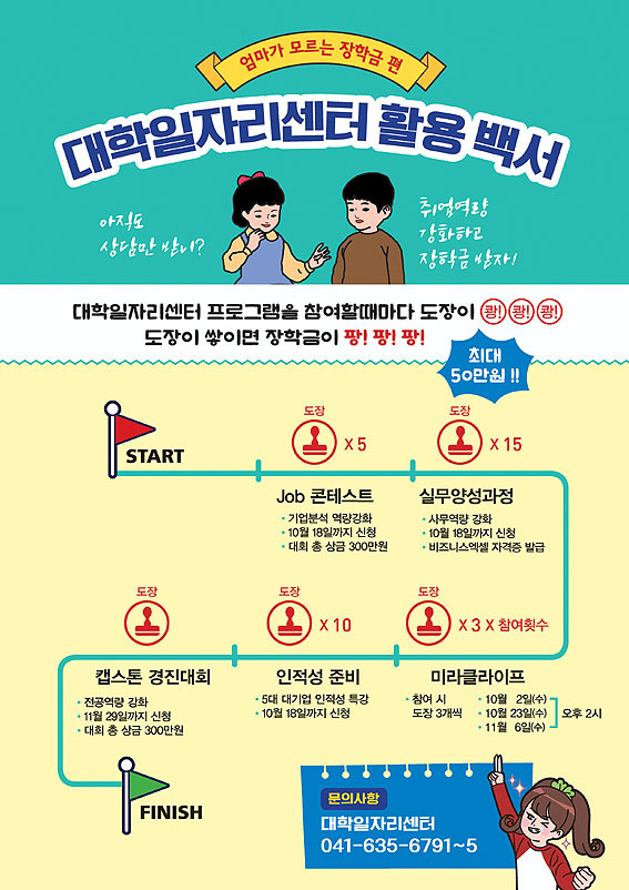 ¡®´ëÇÐÀÏÀÚ¸®¼¾ÅÍ È°¿ë¹é¼¡¯´Â ´ëÇÐÀÏÀÚ¸®¼¾ÅÍ ÇÁ·Î±×·¥¿¡ Âü¿©ÇÏ´Â Çлý¿¡°Ô ÀÎÁõ µµÀåÀ» Âï¾îÁÖ°í, µµÀåÀÌ ½×À̸é ÃÖ´ë 50¸¸¿øÀÇ ÀåÇбÝÀ» Áö¿øÇÏ´Â °ÍÀ¸·Î Ãë¾÷¿¡ ´ëÇÑ ÇлýµéÀÇ °ü½É°ú ¿ª·®À» ³ôÀ̱â À§ÇØ ¸¶·ÃÇß´Ù.