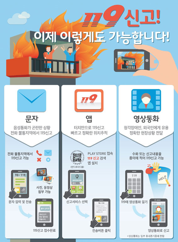 ¹®ÀڽŰí´Â 119¹øÈ£·Î ¹®ÀÚ ÀÔ·Â ÈÄ Àü¼ÛÇÏ¸é ½Å°í°¡ Á¢¼öµÇ¸ç »çÁø°ú µ¿¿µ»óµµ ÷ºÎÇÒ ¼ö ÀÖ´Ù. ¿µ»óÅëÈ·Î 119½Å°í Á¢¼ö ½Ã ¹Ù·Î 119»óȲ½Ç·Î ¿¬°áµÅ º¸´Ù Á¤È®ÇÑ ÇöÀåÁ¤º¸¸¦ ÀüÆÄÇÒ ¼ö ÀÖ´Ù.