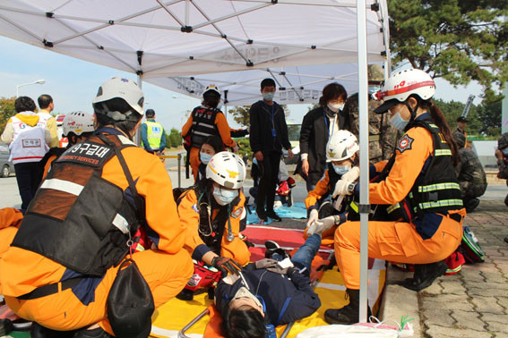 À̹ø ÈÆ·ÃÀº »ï¾ç»ç ¾Æ»ê°øÀå¿¡¼ ºÐÁø¿¡ ÀÇÇÑ Æø¹ßÀÌ ¹ß»ýÇÏ¿© ´ëÇüÈÀç ¹ß»ý ¹× °Ç¹° ÀϺΰ¡ ºØ±«µÈ »óȲÀ» °¡Á¤ÇØ ½Ç½ÃµÆÀ¸¸ç, °¢Á¾ Àç³ ¹ß»ý ½Ã ±ä±Þ±¸Á¶ À¯°ü±â°ü°£ÀÇ »óÈ£ °øÁ¶Ã¼Á¦¸¦ ±¸ÃàÇØ ½Å¼ÓÇÑ ÈÀçÁø¾Ð°ú »ç»óÀÚ¸¦ ±¸Á¶ÇØ Àç³À» Ãʱ⿡ ¼ö½ÀÇϰí, À¯°ü±â°ü ÇÕµ¿ ¾ÈÀüÁø´Ü ¹× Àç³¼ö½ÀȰµ¿ µîÀÇ Àç³ÀçÇØ º¹±¸ Ȱµ¿ ´É·ÂÀ» Çâ»ó½ÃÄÑ ÀÎ¸í ¹× Àç»êÇÇÇØ¸¦ ÃÖ¼ÒÈ Çϴµ¥ ¸ñÀûÀ» µÎ°í ÈÆ·ÃÀ» ½Ç½ÃÇß´Ù.