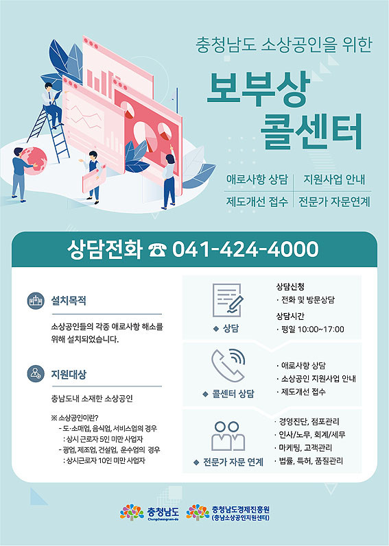 º¸´Ù ÀÚ¼¼ÇÑ ÃæÃ»³²µµ ¼Ò»ó°øÀÎ Áö¿ø»ç¾÷ ¾È³»´Â Ãæ³² º¸ºÎ»ó Äݼ¾ÅÍ 041-424-4000À» ÅëÇØ È®ÀÎÇÒ ¼ö ÀÖ´Ù.