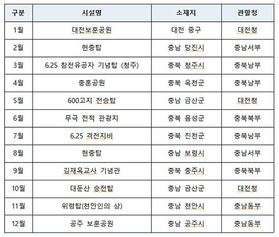 2020³â ÀÌ´ÞÀÇ ÇöÃæ½Ã¼³·Î´Â 1¿ù ´ëÀüº¸Èưø¿ø(´ëÀü Áß±¸), 2¿ù ÇöÃæÅ¾(Ãæ³² ´çÁø), 3¿ù 6¡¤25ÂüÀüÀ¯°øÀÚ ±â³äž(ÃæºÏ ûÁÖ) µî 6¡¤25°ü·Ã 12°³¼Ò ÇöÃæ½Ã¼³ÀÌ ¼±Á¤µÆ´Ù.