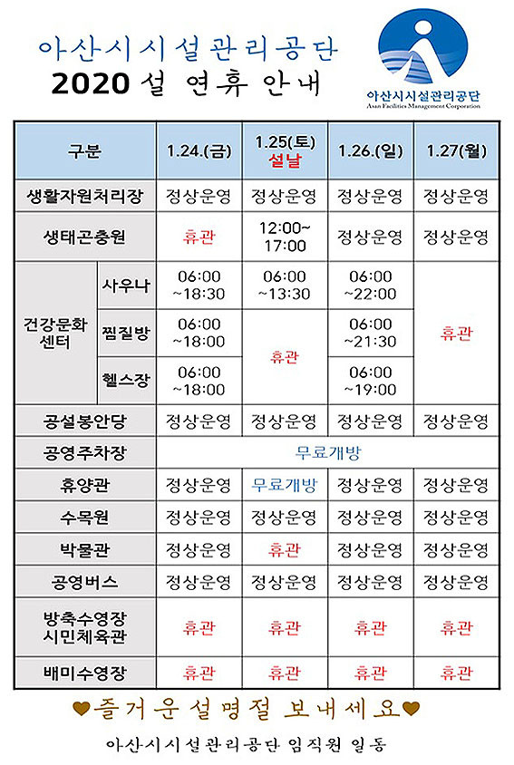 ¼³ ¿¬ÈÞ ±â°£ ¿î¿µ¿¡ °üÇÑ ÀÚ¼¼ÇÑ »çÇ×Àº °ø´Ü ȨÆäÀÌÁö(www.asanfmc.or.kr)¸¦ Âü°íÇÏ¸é µÈ´Ù.