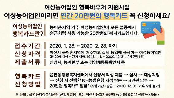 ¿©¼º³ó¾î¾÷ÀÎ Çູ¹Ù¿ìó Áö¿ø»ç¾÷Àº ¿©¼º³ó¾î¾÷Àο¡°Ô Àü±¹ ¾îµð¼³ª ¿¬°£ 20¸¸ ¿øÀ» Çö±Ýó·³ »ç¿ëÇÒ ¼ö ÀÖ´Â º¹ÁöÄ«µå¸¦ Áö¿øÇÏ´Â »ç¾÷ÀÌ´Ù.
