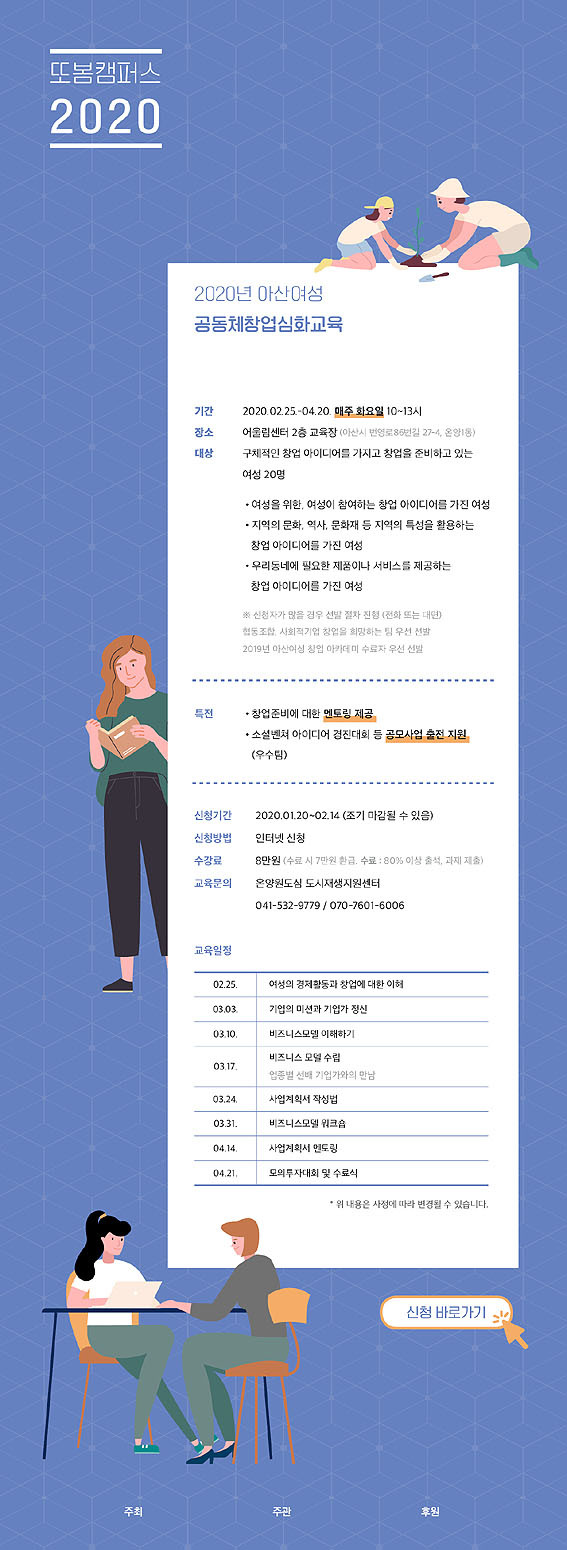 ¾Æ»ê½Ã(½ÃÀå ¿À¼¼Çö)°¡ 2¿ù 25ÀϺÎÅÍ 4¿ù 21ÀϱîÁö ¾î¿ï¸²°æÁ¦¼¾ÅÍ¿¡¼¿©¼º °øµ¿Ã¼Ã¢¾÷ ½Éȱ³À° ¡®¶Çº½ Ä·ÆÛ½º 2020¡¯À» ¿î¿µÇÑ´Ù.