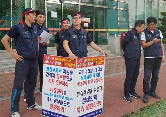 Àü±¹¿ìÁ¤³ëµ¿Á¶ÇÕÀº ¡°¿ì¸®ÀÇ Àγ»´Â ÇѰ迡 ´Ù´Ù¶ú´Ù. Àå½Ã°£ Á߳뵿À¸·Î Áþ´·Á »ç¶ûÇÏ´Â °¡Á·°ú µû¶æÇÑ ¹ä ÇÑ ³¢ Á¦´ë·Î ¸øÇÏ´Â »îÀÌ ¹«½¼ Àǹ̰¡ ÀÖ´Ü ¸»Àΰ¡. ´õ ÀÌ»ó ¿ìÁ¤»ç¾÷º»ºÎ¿¡°Ô ¿ì¸®ÀÇ »ýÁ¸À» ¸Ã±æ ¼ö ¾øµð¡±¸é¼ ¡°ÀÌ¿¡, ¿ì¸®´Â 3¸¸¿© Á¶ÇÕ¿øÀÇ °Ã¶ °°Àº ÅõÁö¸¦ ÇÑ µ¥ ¸ð¾Æ ´ÙÀ½°ú °°ÀÌ °áÀÇÇÑ´Ù¡±°í õ¸íÇß´Ù.