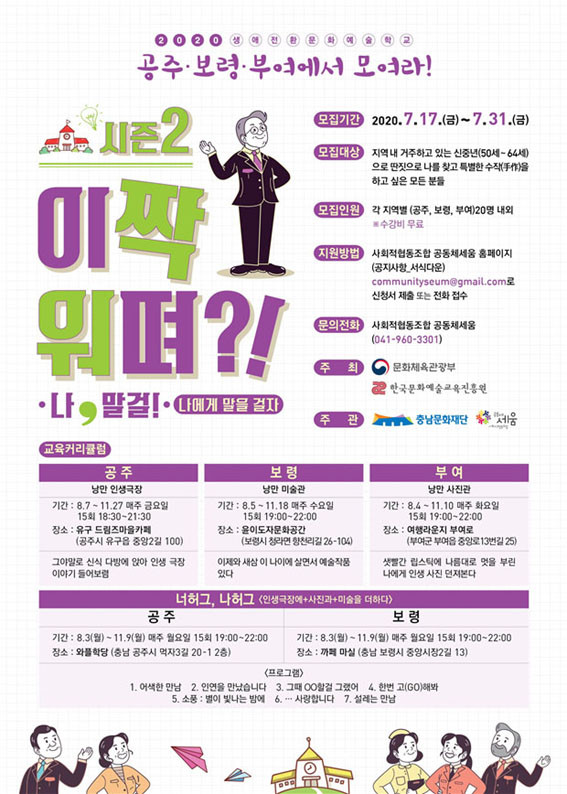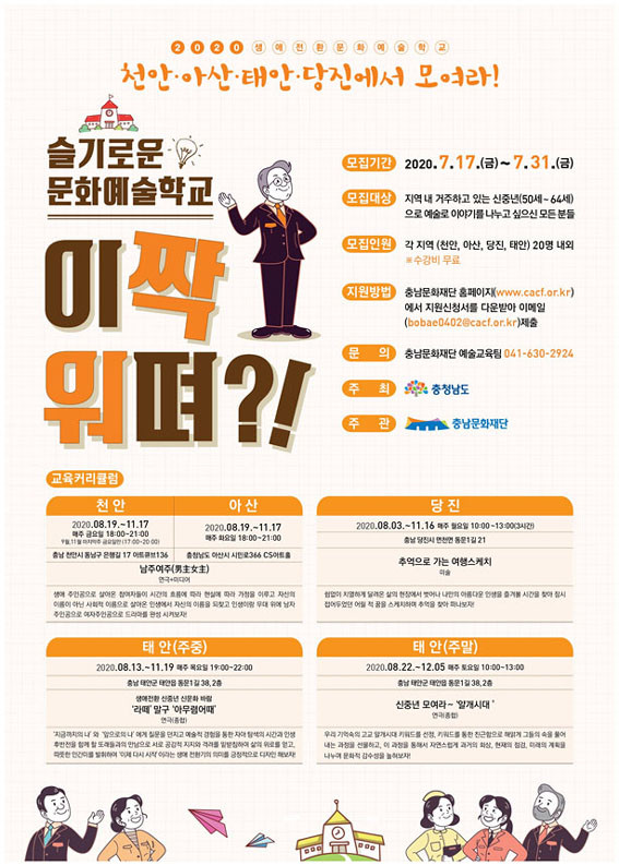 ¡®2020 »ý¾ÖÀüȯ ¹®È¿¹¼úÇб³¡¯ Âü°¡ÀÚ ¸ðÁýÀº 8¿ù ÇÑ ´Þ µ¿¾È »ó½Ã·Î ÁøÇàÇÒ ¿¹Á¤ÀÌ´Ù. ¹®È¿¹¼ú·Î À̾߱⸦ ³ª´©°í ½ÍÀº Ãæ³² µµ³» °ÅÁÖ ÁßÀÎ ½ÅÁß³â(50¼¼~64¼¼)ÀÌ¸é ´©±¸³ª ½Åû °¡´ÉÇÏ´Ù. ¼¼ºÎ ÇÁ·Î±×·¥ ³»¿ë ¹× ½Åû ¹æ¹ýÀº Ãæ³²¹®ÈÀç´Ü ȨÆäÀÌÁö(www.cacf.or.kr)¿Í »çȸÀûÇùµ¿Á¶ÇÕ °øµ¿Ã¼ ¼¼¿ò ȨÆäÀÌÁö(https://communityseum.org)¿¡¼ °¢°¢ È®ÀÎÇÒ ¼ö ÀÖ´Ù.