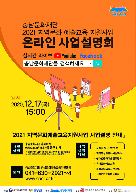 Ãæ³²¹®ÈÀç´Ü(´ëÇ¥ÀÌ»ç ±èÇö½Ä)Àº ¿À´Â 12¿ù 17ÀÏ ¿ÀÈÄ 3½Ã¡®2021 Áö¿ª¹®È ¿¹¼ú±³À° Áö¿ø»ç¾÷ ¼³¸íȸ¡¯¸¦ Ãæ³²¹®ÈÀç´Ü À¯Æ©ºê¿Í ÆäÀ̽ººÏ¸¦ ÅëÇØ ½Ç½Ã°£ ¶óÀ̺ê·Î °³ÃÖÇÑ´Ù.